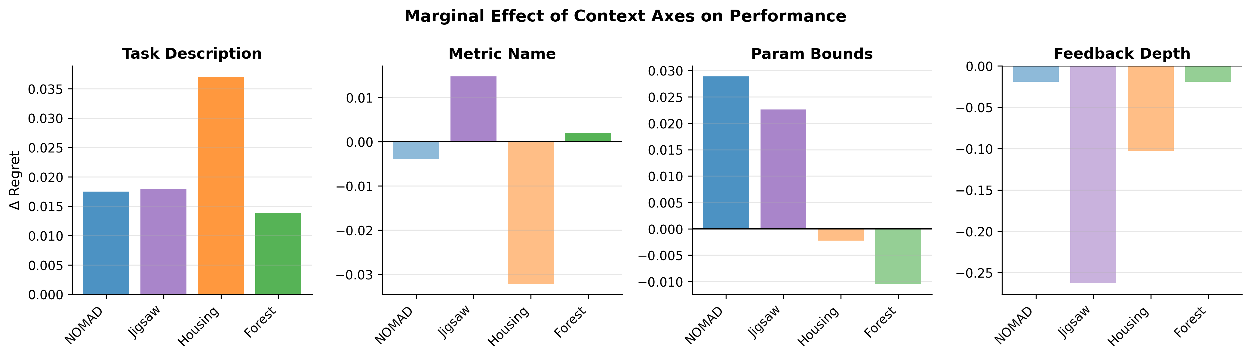 We vary four orthogonal axes of context visibility. Across these axes, we construct a full factorial grid of 16 context policies and evaluate agent behavior on four machine learning benchmarks: NOMAD materials regression, Forest Cover classification, California Housing regression, and Jigsaw toxicity classification.